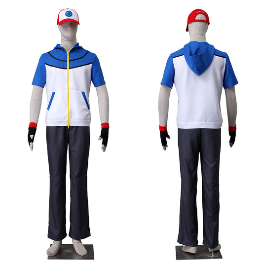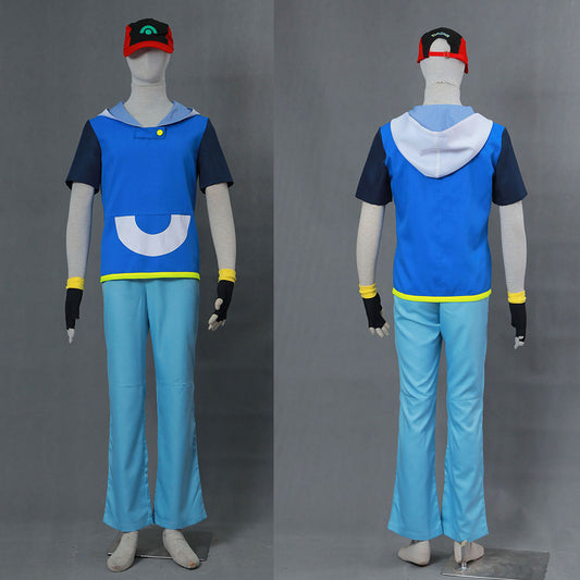 Men and Kids Anime Pokemon Costume Trainer Ash Ketchum Short Sleeves Cosplay Suit with Accessories